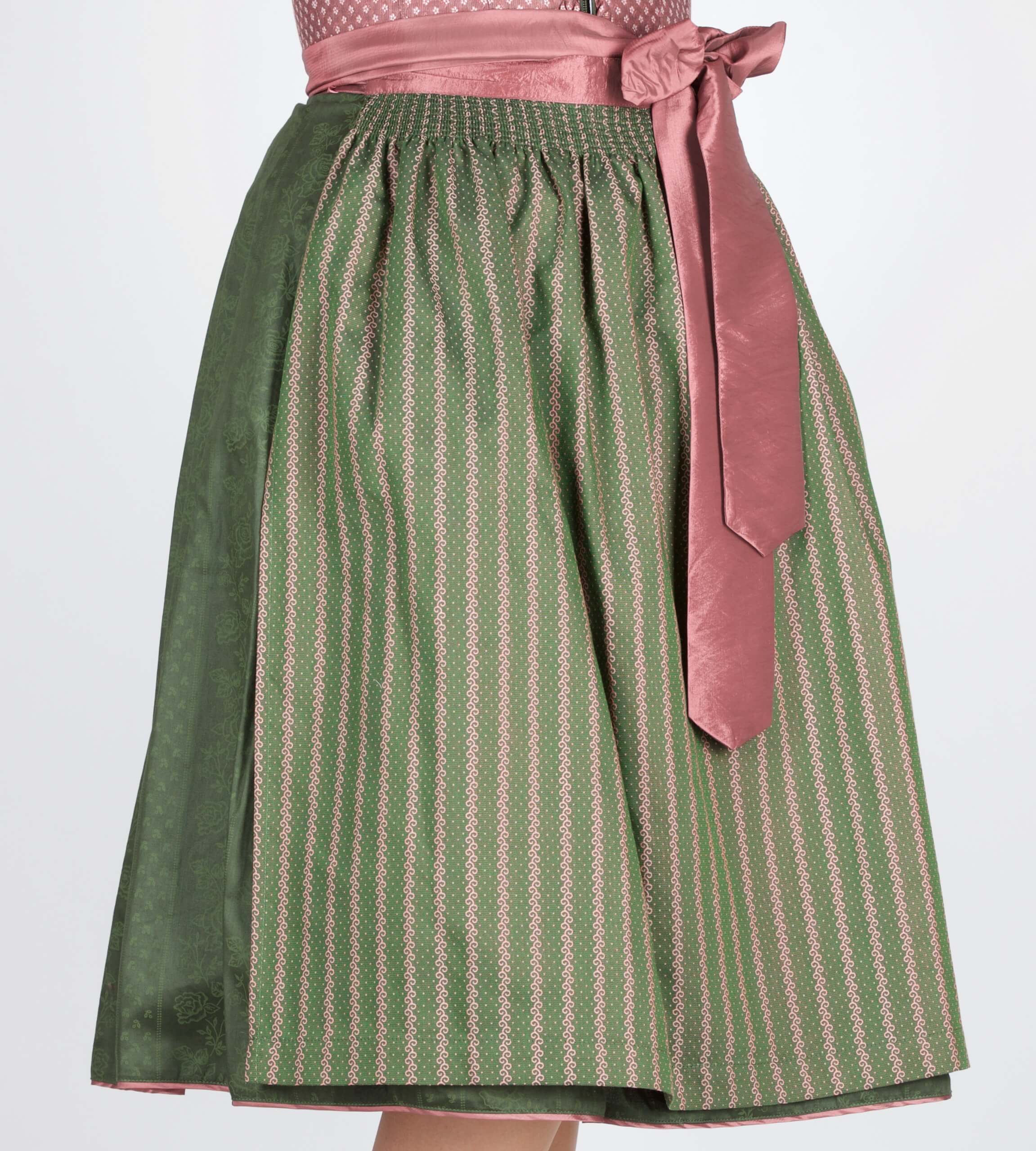 Die Schürze im Mustermix in oliv altrose , unterstreicht den edlen Look von diesem Dirndl.